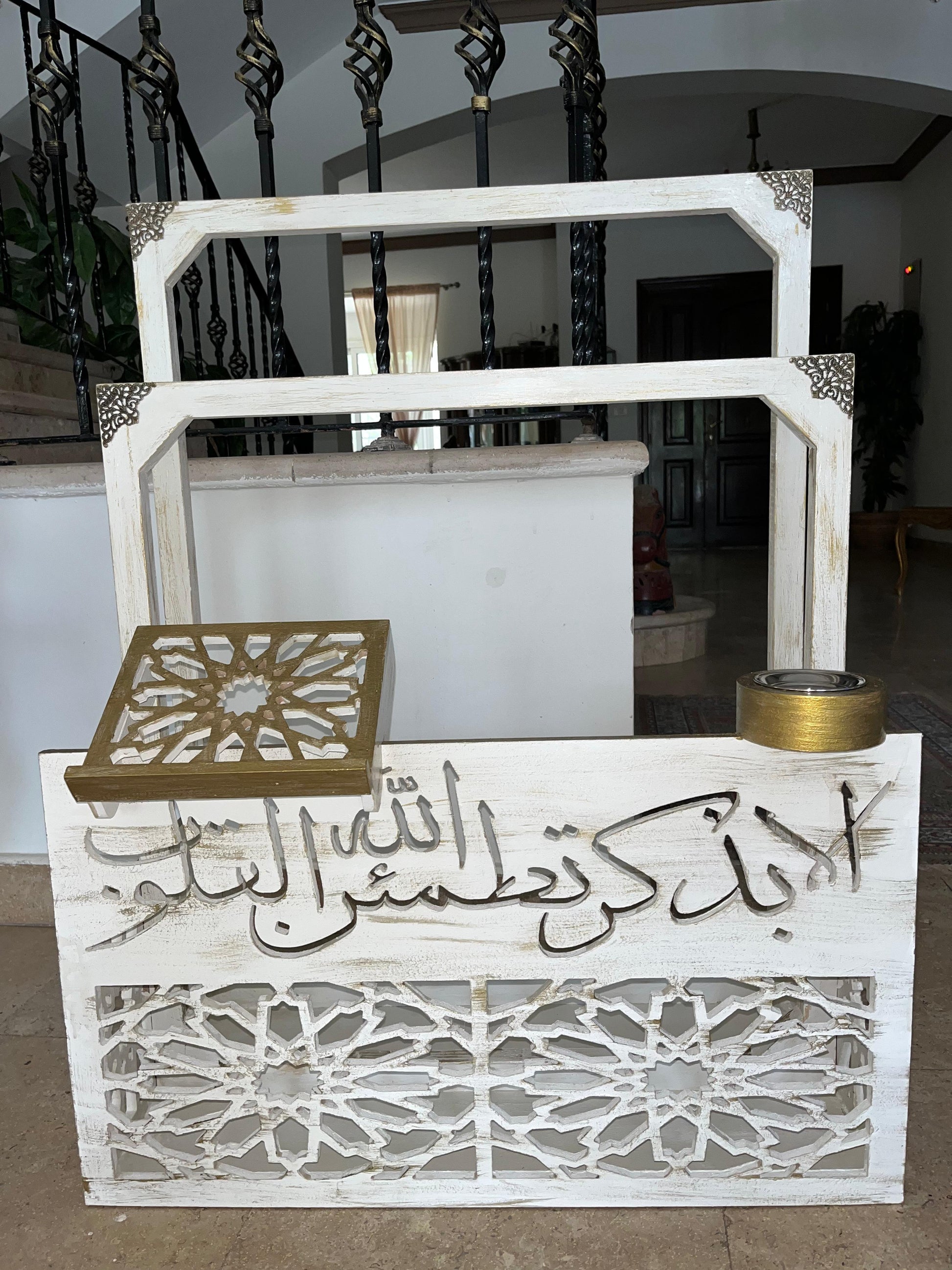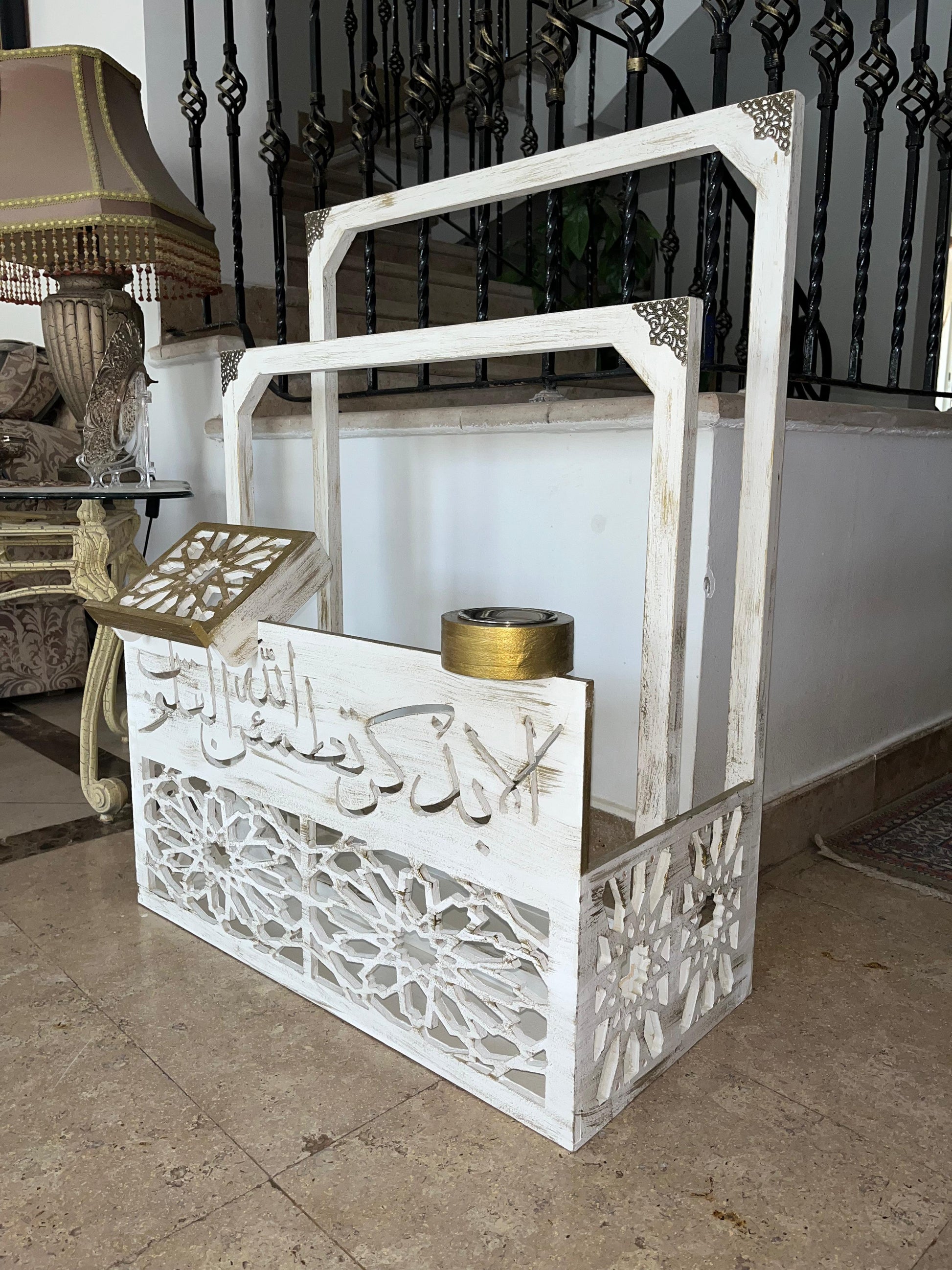 Prayer rug stand with movable Quran holder and incense burner, off-white with golden oxidized engraving, brass accents . Color can be changed.